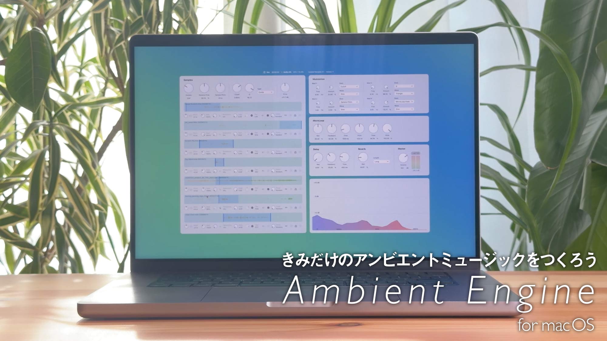 Ambient Engine は、自分のサンプルを取り込み、スライス・ランダム再生・モジュレーションによって進化し続けるアンビエント音楽・サウンドテクスチャを生成する macOS用ソフトウェアです。