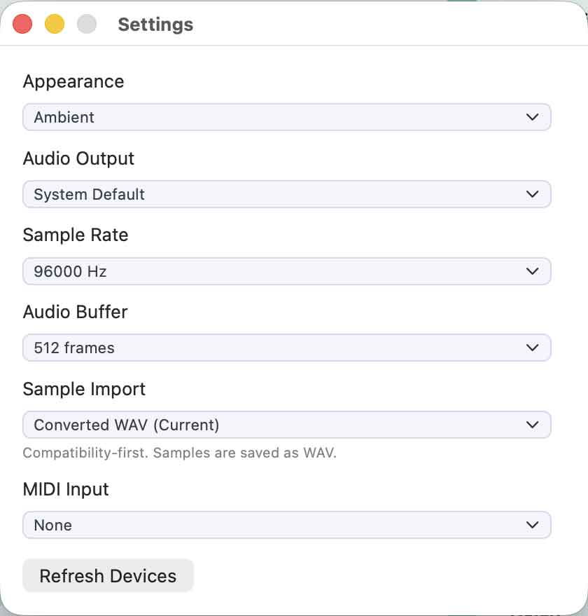 Ambient Engine is a macOS application that generates evolving ambient textures by combining sample import, slice editing, random playback, and modulation.